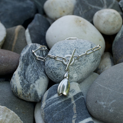 A Sterling silver hydrangea flower bracelet. This floral bracelet has two flowers sitting across your wrist with an oval chain and a T-bar catch. Hallmarked botanical jewellery, made by hand in England. New for this year and to match with my hydrangea posy necklace,