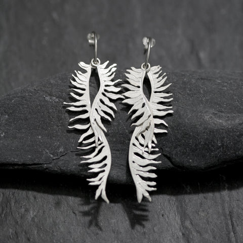 Ginkgo leaf drop earrings, handmade in Sterling silver. Available in polished silver, or in 18ct rose gold or 22ct yellow gold vermeil plate. Botanical jewellery made in England.