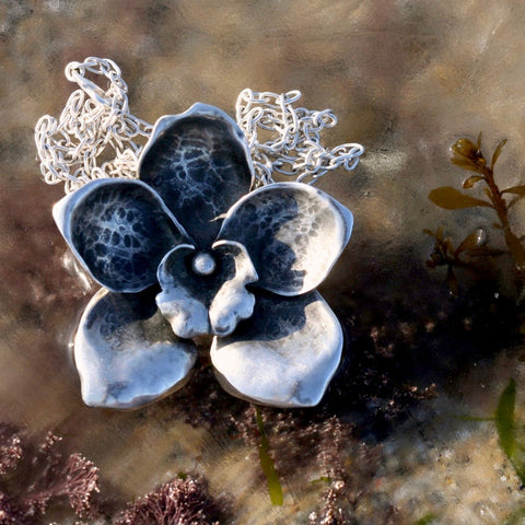 Large Orchid floral brooch solid silver with a 2 inch pin measures 6x6.5com and weighs 28.4 grams. My very sculptural Sterling silver large orchid flower is made in three pieces before being assembled, burnished and carefully oxidised to produce a beautifully balanced statement brooch.