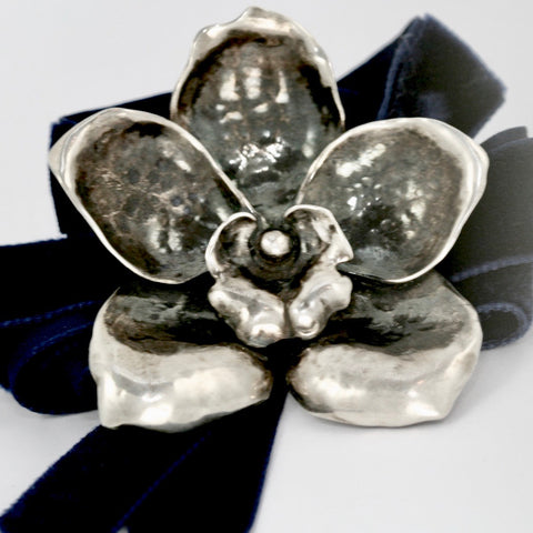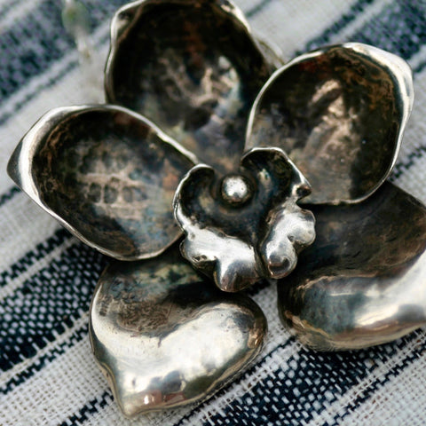 My very sculptural Sterling silver large orchid flower is made in three pieces before being assembled, burnished and carefully oxidised to produce a beautifully balanced statement necklace. Set on a lovely heavy 100 flat oval 18 inch chain with a handmade hook catch.