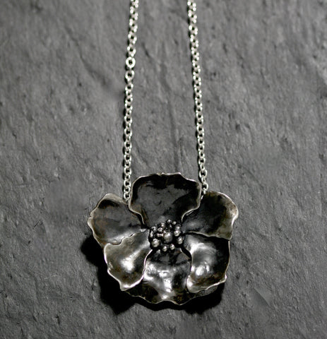 Large poppy choker in solid Sterling silver with a 12 inch plush velvet tie measures 5cm by 5.5cm and weighs 30grams. Handmade statement jewellery, hallmarked in London.