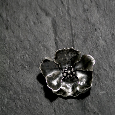 My statement large Poppy flower Silver choker is made in three pieces with molten silver droplets forming the very centre. Before being assembled, burnished and oxidised I shape each one to produce a beautifully balanced poppy. Set on a half inch dark velvet one can change the colour to suit your mood and can also be worn tied on your wrist to great effect