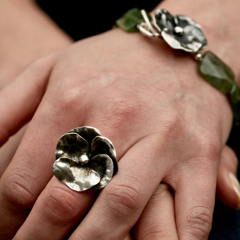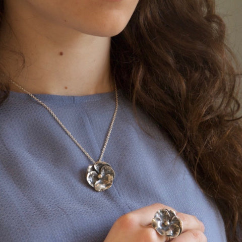 2 handmade Sterling silver pansy flowers hang asymmetrically on fine chains from a 16 inch silver chain creating a longer necklace with a T-bar catch. The pansy blooms are oxidised then re-polished by hand. Every piece is unique. Botanical jewellery handmade in England.
