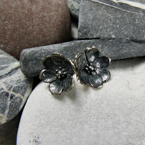 Handmade Sterling silver rose flower cufflinks on a ball ended post. Made in England, hallmarked in London. I have designed the post as slightly longer to ease the ritual of putting them on and also a ball that will snugly pass through the tightest of buttonhole. The inside of the rose bloom is oxidised. Flower gifts for men.